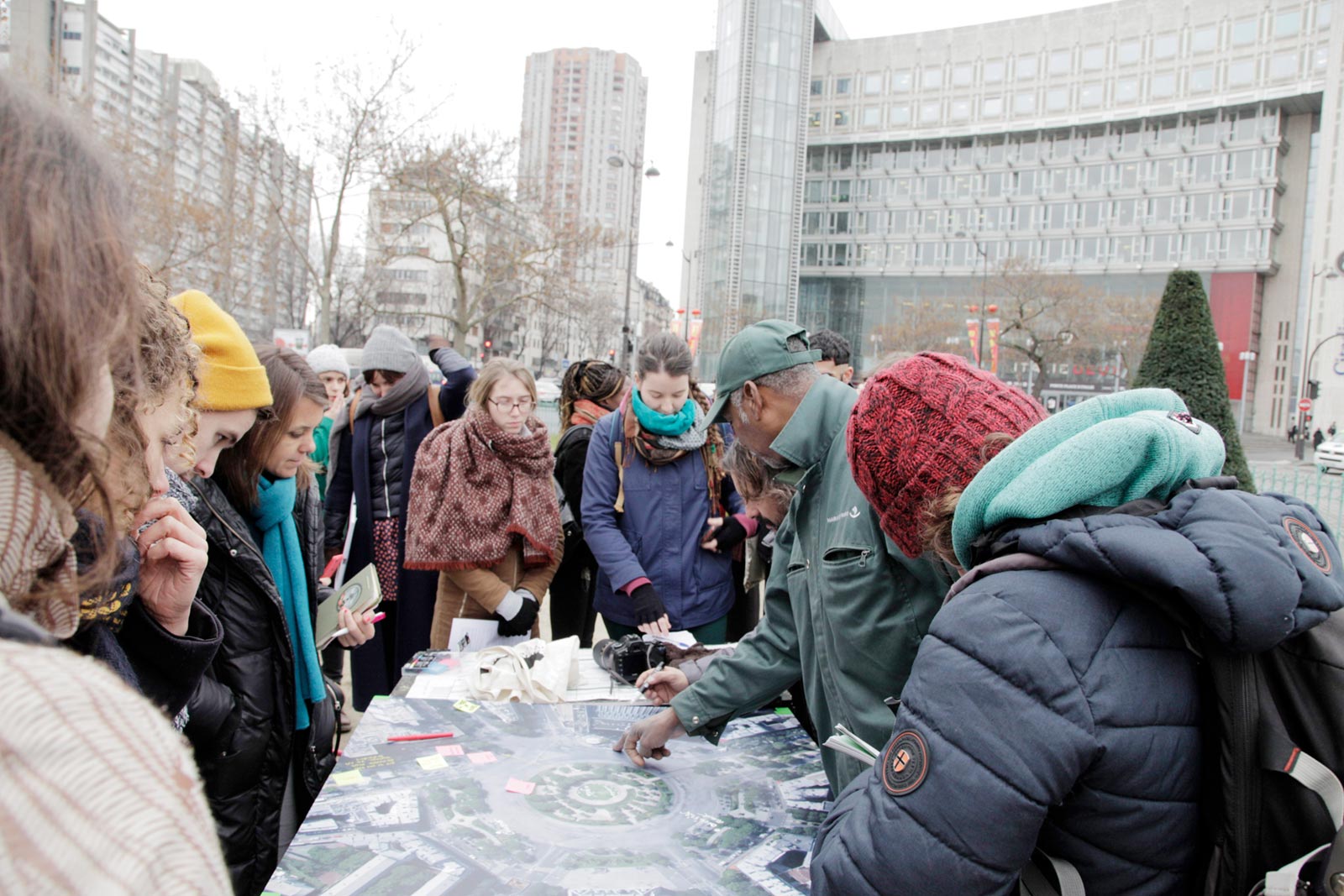 They begin this process with community engagement, wherein multiple meetings are held to gather diverse ideas. These meetings are a form of collectivization, wherein original cartographic and visualization tools are developed to help all participants arrive at a shared project vision.