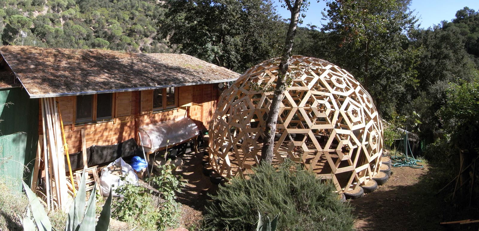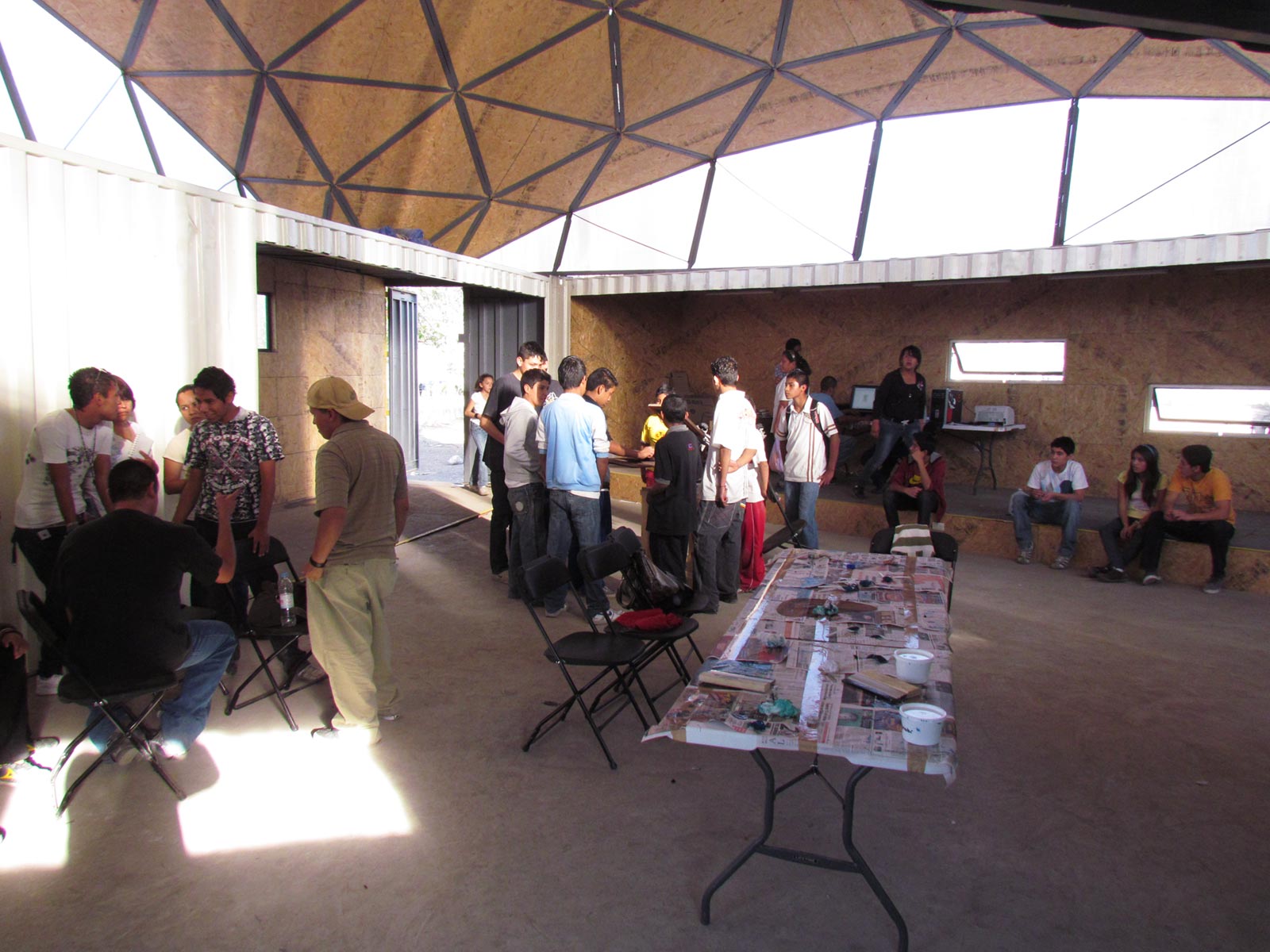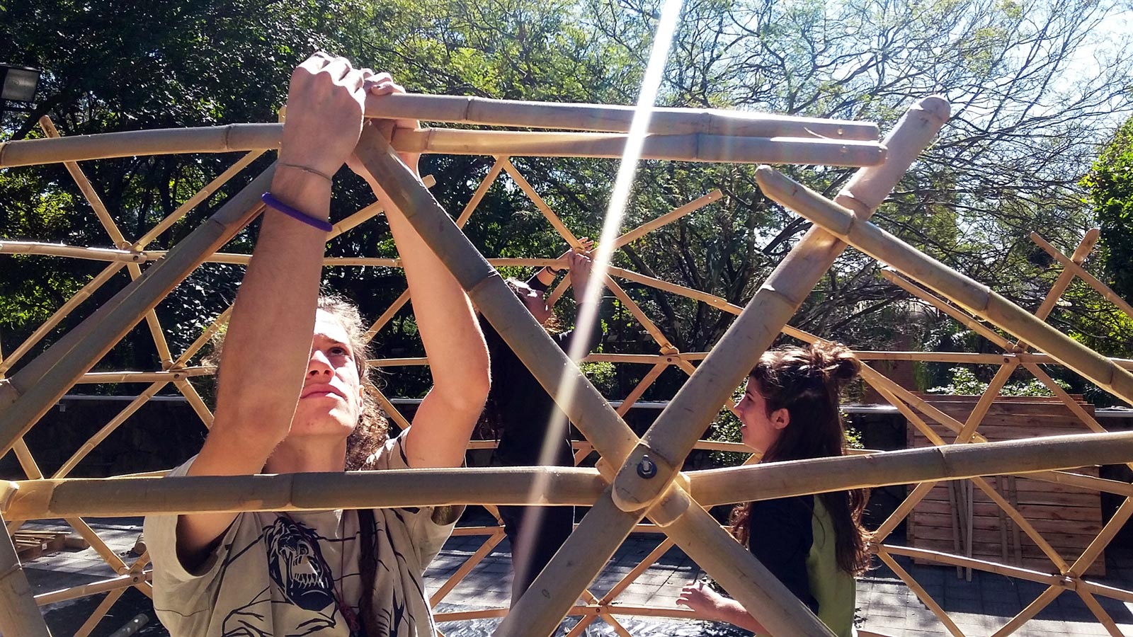 Recently, Ctrl+Z has had a particular focus on low-tech, low-cost geodesic domes. Since 2010, Ctrl+Z has been teaching a series of educational workshops and programs entitled “Geodesic Geometries,” wherein students are encouraged to utilize found and recycled material in a collaborative manner. Experiments have been conducted with pallets, and window blinds, with an emphasis on helping students understand how materials can be multi-purposed.