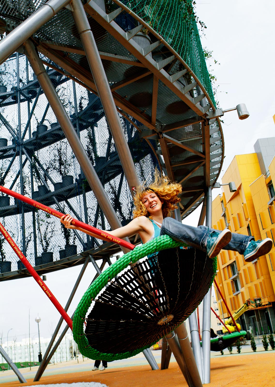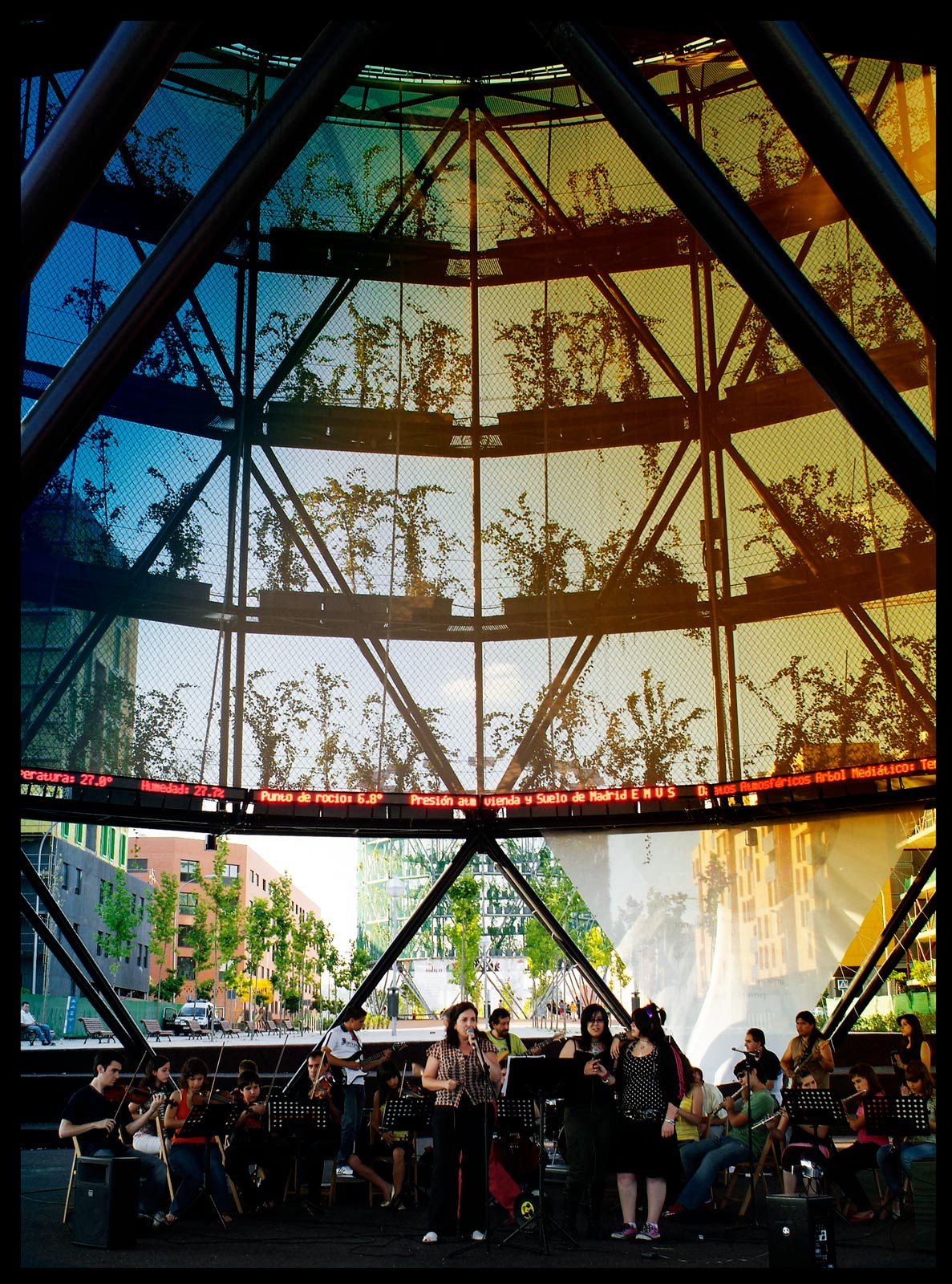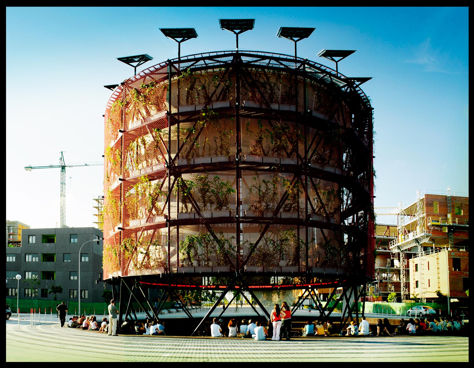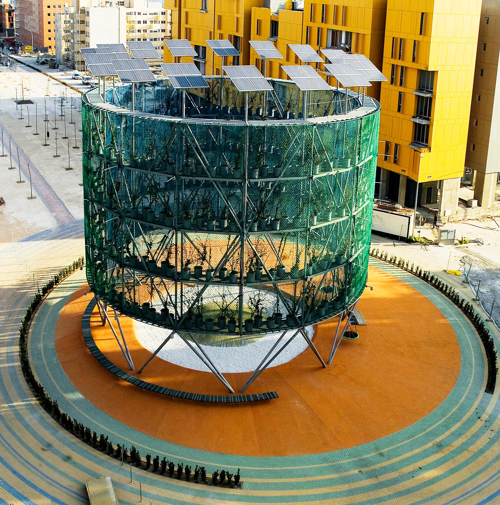 They are also known for green projects such as Ecobulevar, a project of ‘air trees’ in the Madrid suburb of Vallecas. These are large, circular pavilions that are made from repurposed industrial materials such as recycled plastic, greenhouse fabric and rubber tires that contain rooting vegetation and atomizers that cool and moisten the air in the cylinder and around it. The cylinders are self sufficient and surplus electricity produced by photovoltaic panels is sold back to the grid, which pays for their maintenance.