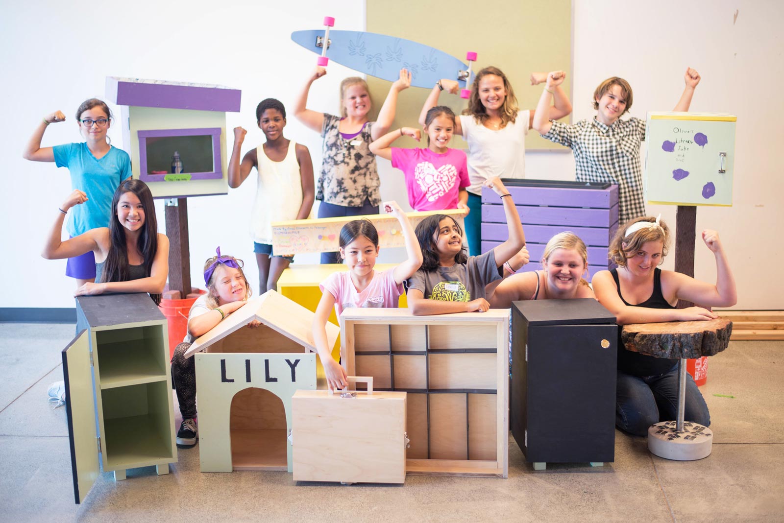 Girls Garage is a physical workspace and year-round program teaching carpentry, welding, architecture, engineering, and activist art through community-focused projects. The program aims to instill confidence in young people by providing them with the skills and tools to build whatever they can imagine. Students attend at no cost, and over two-thirds of them return for 3 or more years. Projects built by students include a greenhouse for a local community garden, a 500-square-foot chicken pavilion for an urban farm, sandboxes for nearby preschools, and a public parklet. Girls Garage has also published a book authored by Pilloton-Lam that includes a tool encyclopedia, stories of builder women, and project guides, and invites girls everywhere to join a movement of fearless builder girls.