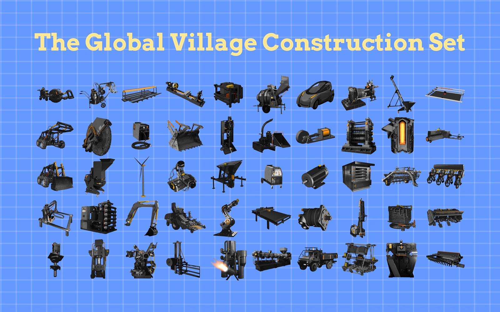 Open Source Ecology is a U.S. non-profit dedicated to creating an open-source economy through global collaboration. At the core of their work is the Global Village Construction Set (GVCS); open-source plans for fifty industrial and agricultural machines. All machines, from tractors to circuit boards, are considered fundamental to contemporary life— what would be required to create a small civilization with modern comforts. The 50 machines are modular and complementary so that they can be endlessly recombined to fit the needs of communities the world over.