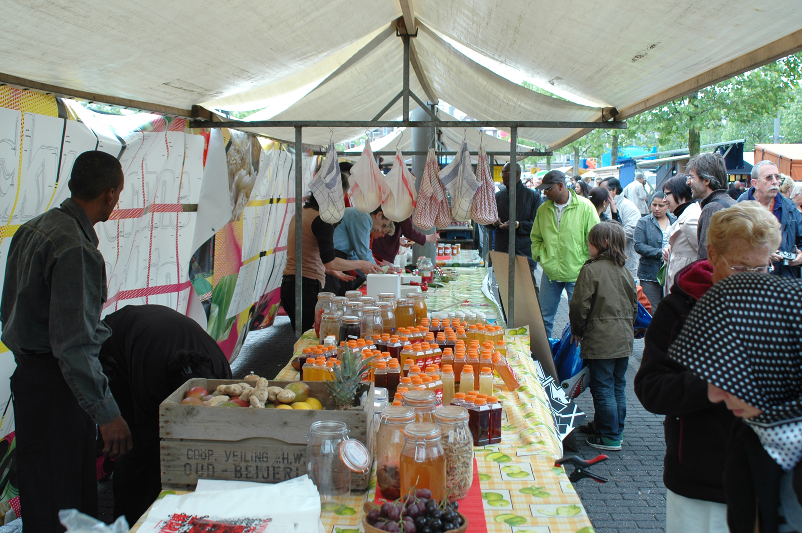 In her 2008 project, Freehouse–Market of Tomorrow, van Heeswijk sought to revitalize Rotterdam’s Afrikaande Market. Working with vendors, artists, designers, and local shopkeepers, she developed a detailed sketch of the ideal market of the future, devoting more attention to diverse high-quality goods and services, and new skill-based collaborative projects. The master plan challenged government regulations that were preventing vendors and the community from establishing sustainable sources of income. The renewal of the market is ongoing, but it has already become the “beating heart” of the Afrikaner district.